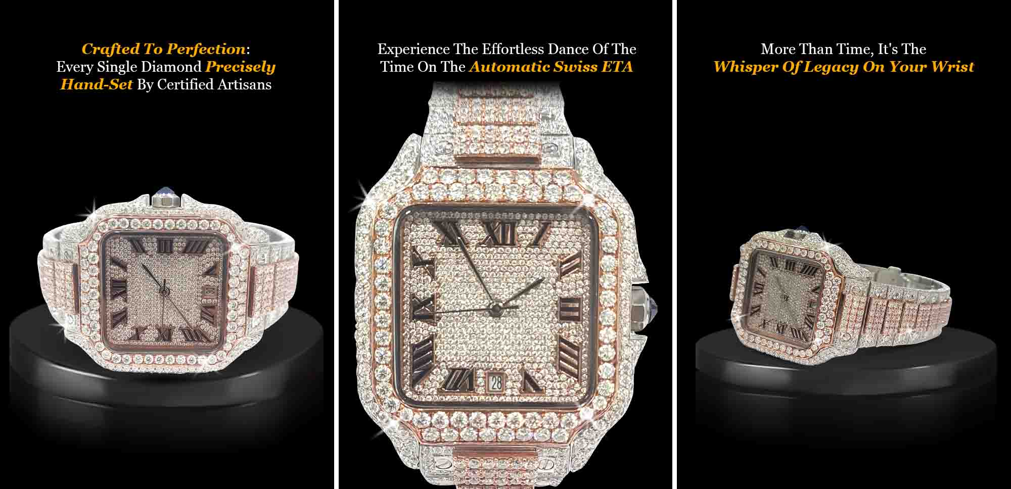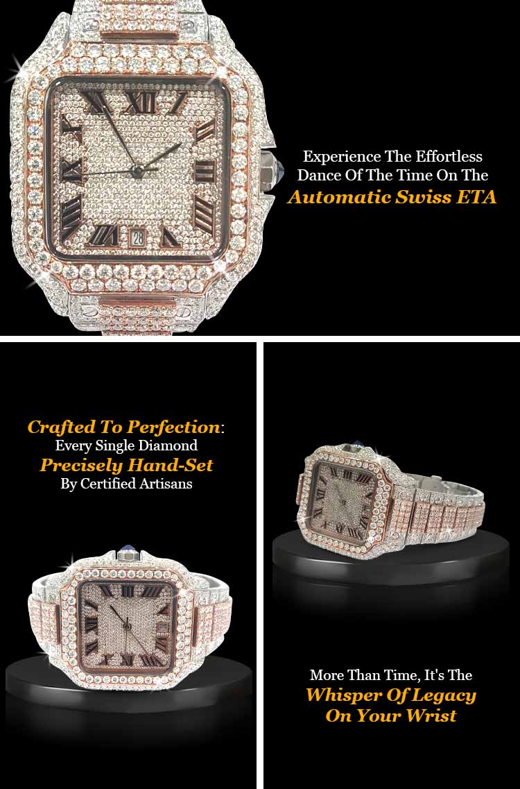 Experience The Perfect Fusion of Luxury and Bold Statement with This Iced Out Watch, Meticulously Customized to Turn Heads. This Timepiece Showcases a Two-Tone Finish of 14k White and Rose Gold, Embodying Elegance and Modern Style. Every Surface is Fully Embellished with High-Quality VVS1 Moissanite Diamonds, Gives It an Opulent and Extravagant "Iced-out" Look.