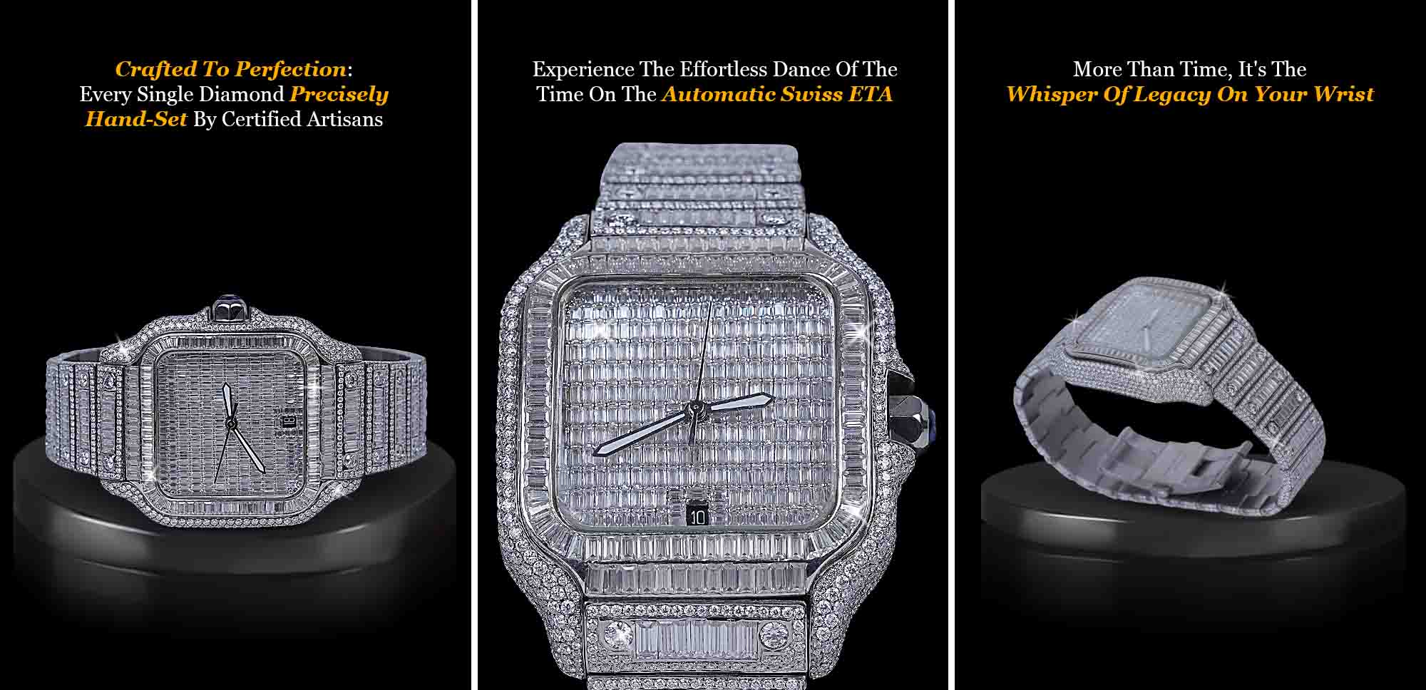 Make a Bold Statement with This Iced Out Watch, Where Timeless Design Meets Modern Luxury. This Stunning Timepiece Boasts a Lavish Iced-Out Design, With High Quality VVS1 Moissanite Diamonds Encrusting The Entire Dial, Bezel, Case, and Bracelet.