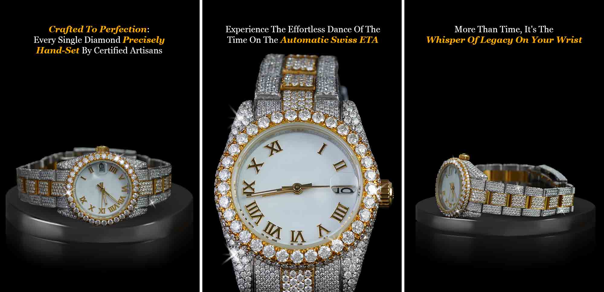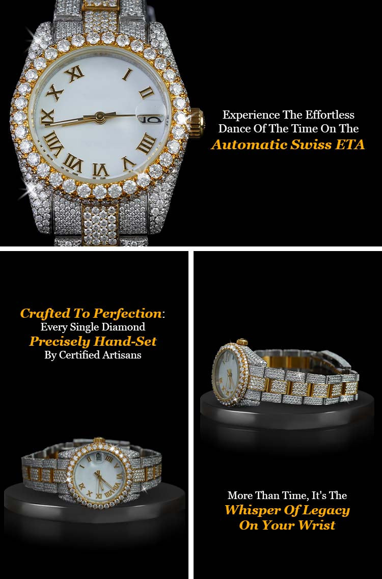 Learn moreTwo Tone Iced Out Watch for Women VVS1 Moissanite 32mm White Roman Dial