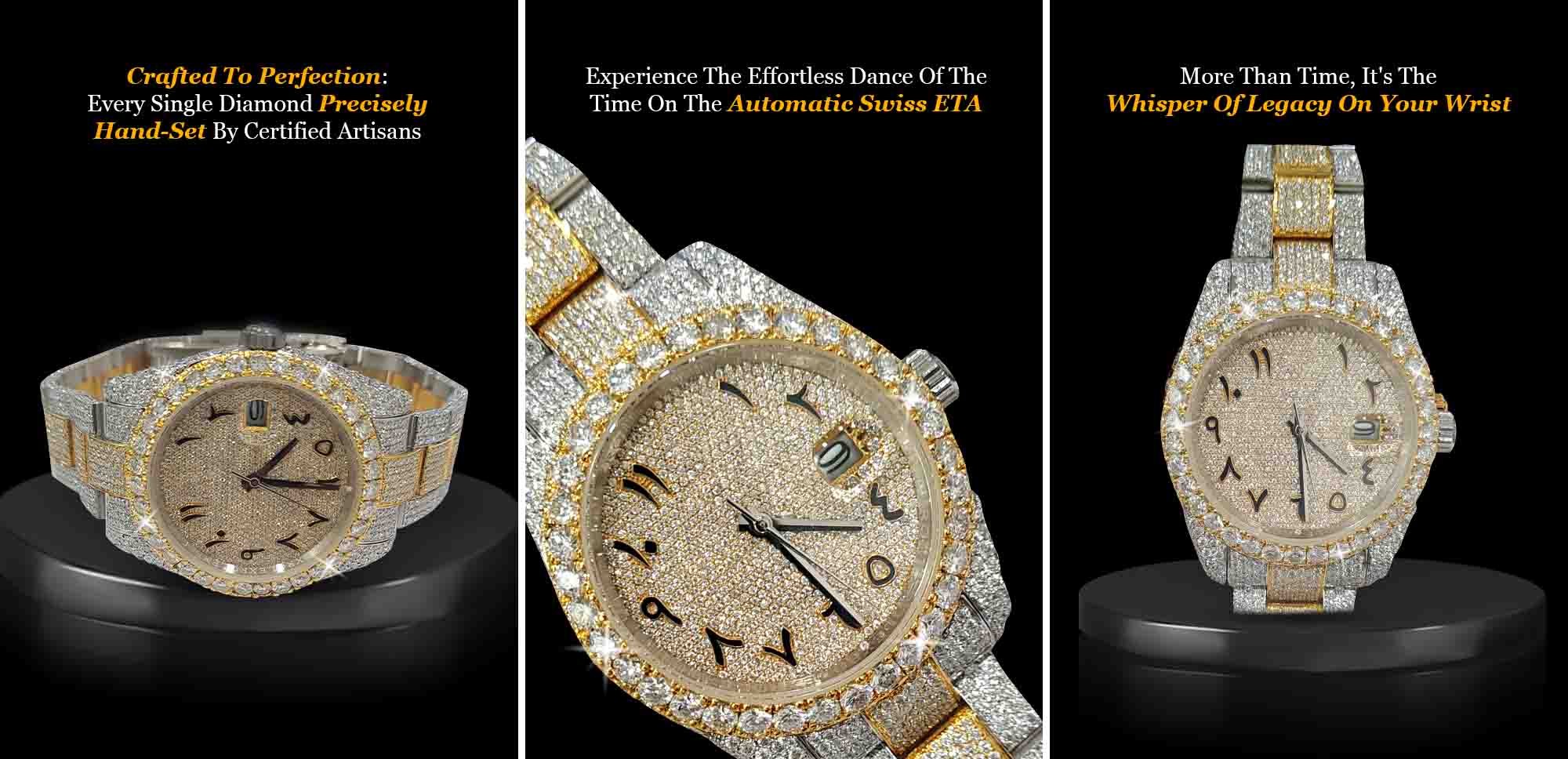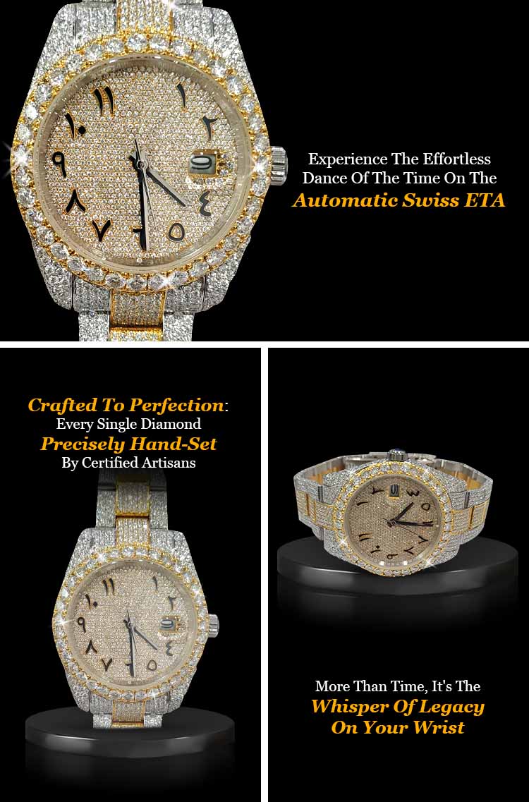 Learn moreVVS1 Moissanite Diamonds Iced Out Watch 40mm Arabic Two Tone