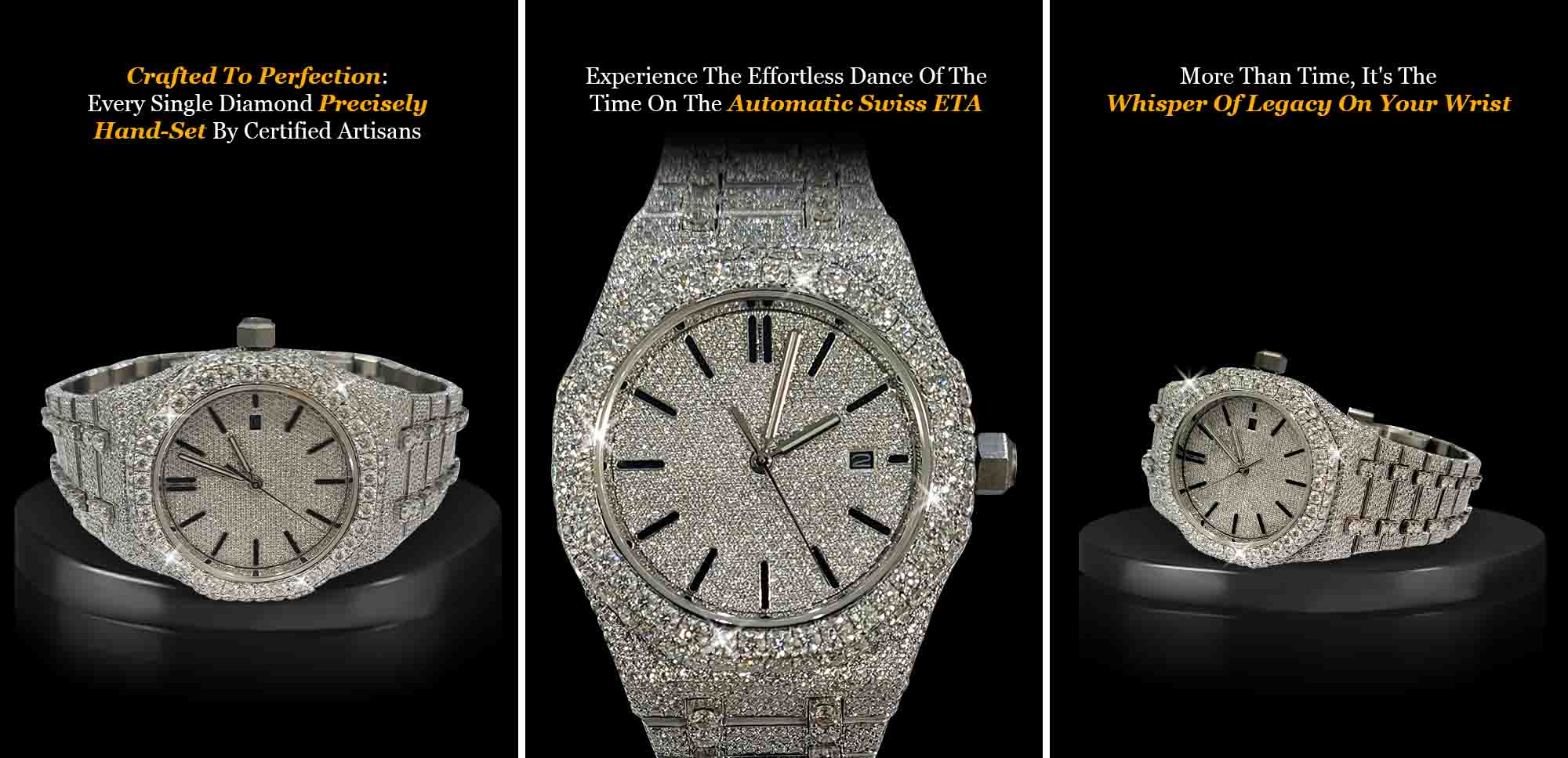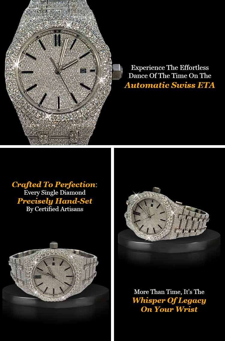 This Luxury Timepiece Draws Inspiration From The Branded Watch Collection, Evident in Its Octagonal Bezel and Integrated Bracelet Structure. This Iced Out Watch Embellished with High-Quality Moissanite Diamonds Across The Case, Bezel, Dial, and Bracelet, Gives It an Opulent and Extravagant "Iced-out" Look. Each Component of The Watch is Encrusted with VVS1 High-Clarity Stones, Creating an Intensely Sparkling, High-End Aesthetic.